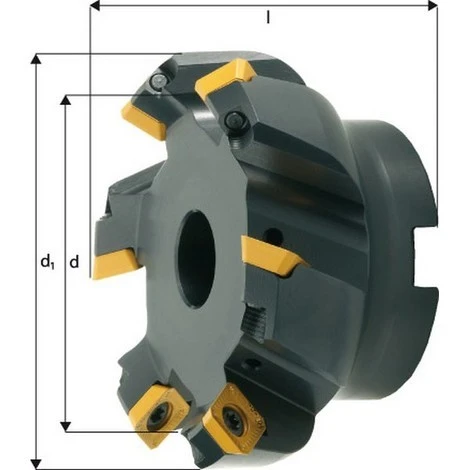 Fraise à surfacer à 45° arrosage interne, Ø d : 80 mm, Nombre de dents 6, Ø du perçage de positionnement 27 mm, Dimensions Ø d1 : 93 mm, Dimensions l : 50 mm, Profondeur de coupe ap : 6 mm, Plaque de coupe réversible SEHT/SEHW 1204… – Coupe douce et peu de vibrations grâce à la géométrie très positive de la coupe – Pour le fraisage d’ébauche et la finition, usage universel Livraison : sans plaques de coupe réversibles, sans tournevis