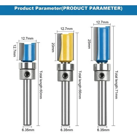 - ăSPĂCIFICATIONSăDiamĂštre de coupe 1/2″ (12,7 mm); tige 1/4″ (6,35 mm); Profondeur de coupe 0,47″ (11,9 mm), 0,79″ (20 mm), 0,98″ (25 mm). Jeu de 3 mĂšches droites Ă double cannelure conçues pour les fraiseuses 1/4″.