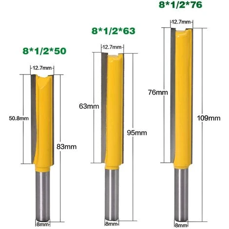 Diamètre de l’arbre: 8 mm; Diamètre de coupe: 1/2 pouce (12.7 mm) Longueur de coupe: 50mm/63mm/76mm; Longueur totale: 83mm/ 95mm/109 mm.